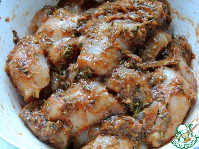 Куриное филе режем небольшими кусочками, заливаем маринадом и оставляем мариноваться (лучше на ночь).