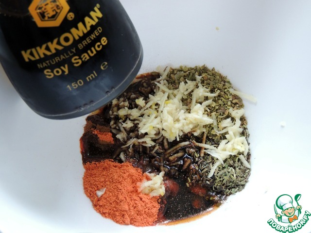 Добавляем соевый соус Kikkoman, сок лимона, масло и тёртый чеснок.