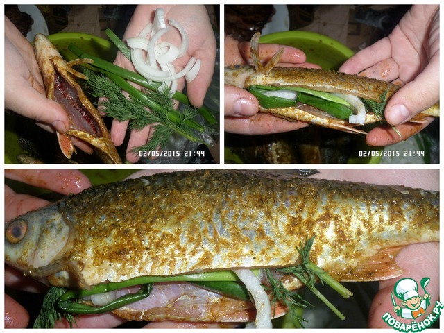 Берем одну рыбку, пару веточек укропа, пару перьев зеленого лука и пару-тройку полуколец репчатого лука. Зелень и лук кладем в брюшко рыбы.