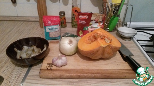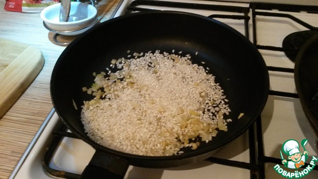 Когда вы изведете половину бульона, добавьте к ризотто тыкву. Можно чуть раньше или чуть позже (зависит от того, насколько мягкой вы хотите ее сделать). В таком варианте она будет готовой, но слегка хрустеть.