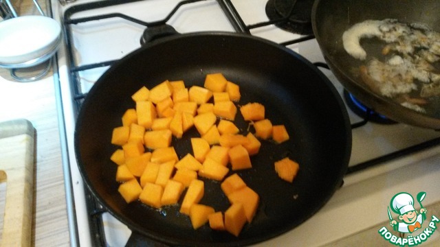 Далее возьмем глубокую сковороду, нальем пару ложек оливкового масла. Обжарим тыкву в течение 5 минут до небольшой золотистой корочки. Переложим в тарелку.