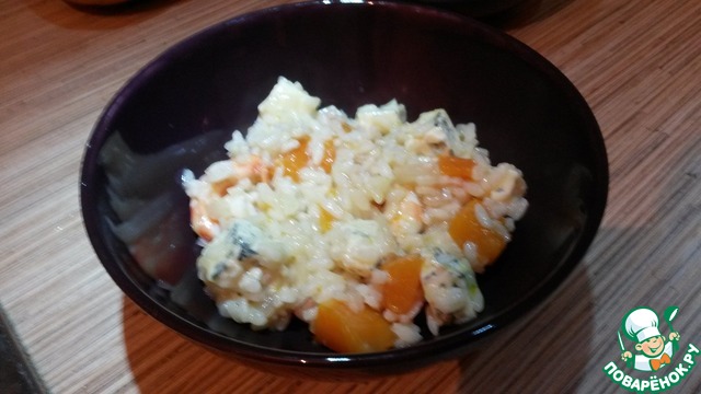 | Я обожаю ризотто! Любые, с овощами, мясом, морепродуктами... Это совершенное блюдо, нежное, легкое, готовится быстро и интересно, подходит для романтического ужина и просто так :) Вариант ризотто с тыквой не оригинален, однако дор блю играет здесь особую роль - даже мой муж, не большой фанат этого сыра, был просто ошеломлен чудесным сочетанием сыра и тыквы с рисом! К этому нежному блюду мы добавили креветки, которые также здесь прекрасно себя чувствуют, а подали с охлажденной бутылочкой божоле нуво (молодое сухое красное вино) - фантастика :) |