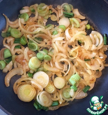 Обжариваем нарезанный лук. Репку и зеленый. На оливковом масле. Курочку режем крупными кусками и обжариваем до подрумянивания.