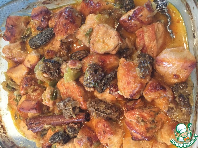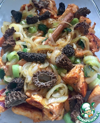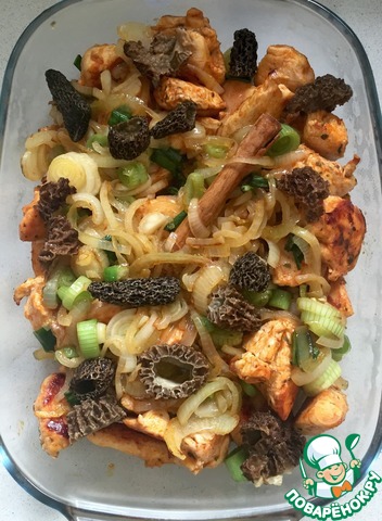 Переложите курочку в огнеупорную форму, сверху высыпьте обжаренный лук, выложите сморчки, слейте воду от грибов ( не до конца. Там точно будет песок). Положите веточку корицы.