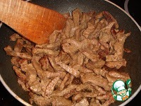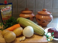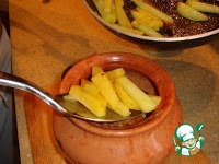 Картофель нарезать брусочками или кубиками, обжарить. Далее начинаем закладывать ингредиенты в горшочки. Сначала мясо, пассированные овощи и картофель.