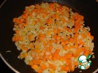 Лук и морковь очистить, промыть, нарезать мелким кубиком и обжарить 3 мин.