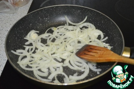 Лук нарезать полукольцами, обжарить на растительном масле лук в течении 2-х минут
