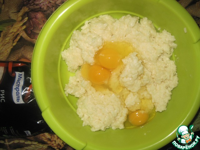 В получившуюся охлажденную до 50 градусов рисовую массу добавляем яйца, тщательно перемешиваем.
