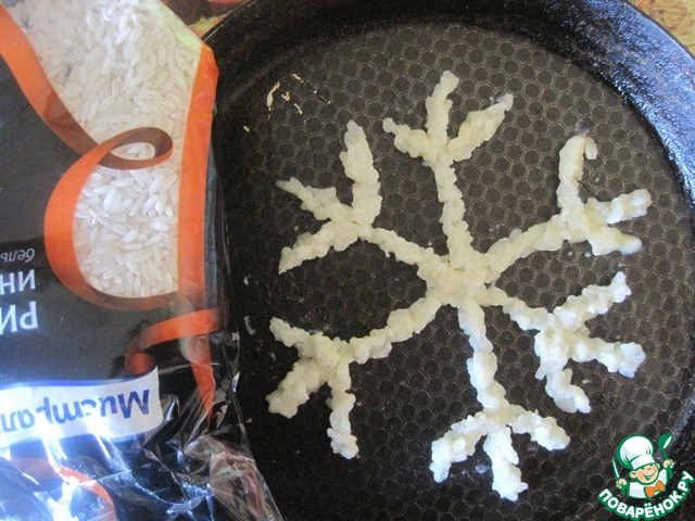 Для приготовления чипсов я оставила рисовую массу 1 ст. л. Выкладываем на смазанную сковороду маслом рисунок чипсов который вам необходим. Я сделала снежинку.