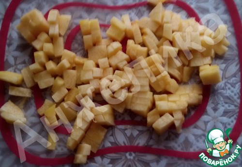 Очищаем от кожуры тыкву и нарезаем ее кубиками.