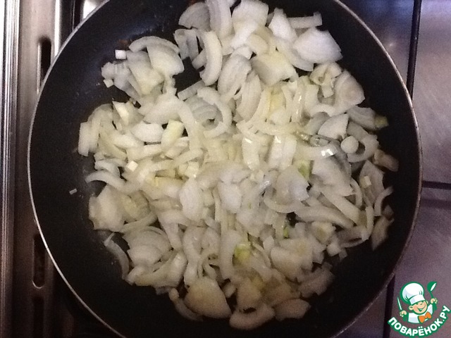 Для начала чистим овощи. Лук режем крупно ( полукольцами) и кладем на разогретую сковороду.