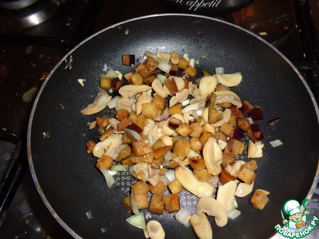 Лук и чеснок мелко нарезать и обжарить на оливковом масле. Добавить грибы и баклажаны ( у меня замороженные, поэтому никакой обработки они не требуют).