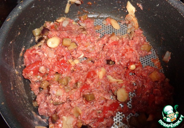 Добавить к обжаренным овощам фарш и часть томатов. Слегка потушить.