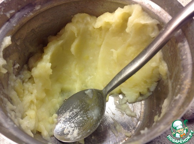 Из пюре формируем колобок, обваливаем в муке, обмачиваем в яйце и в панировочных сухарях, обжариваем с всех сторон. Кладём на тарелку, поливаем уксусом, наслаждаемся.