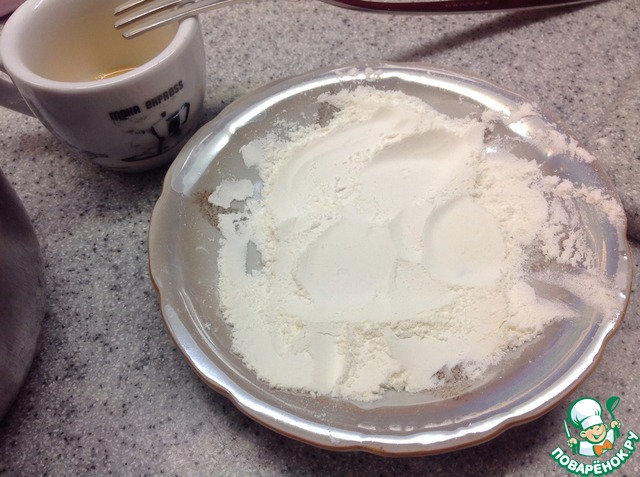 Второе яйцо взбиваем в маленькой мисочке. Тарелку положить муку.