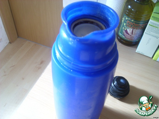 Итак, для приготовления варенца нам необходимо топлёное молоко.Вот им-то мы и займёмся в первую очередь.Вскипятить молоко и горячим залить в термос, ОБЯЗАТЕЛЬНО со стеклянной колбой, стальные термосы не подходят так как со временем теряют температуру.Оставить где-то на 10-12 часов.Преимущество этого способа в том, что количество молока при такой обработке не уменьшается, в отличие от приготовления в духовке.