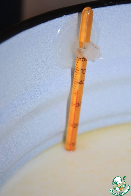 Молоко нагреть до 35 градусов. Добавить мезофильную закваску прямого внесения. Оставить на 5 минут, чтобы закваска пропиталась, и перемешать круговыми движениями. Оставить на полчаса для того, чтобы начали работать бактерии закваски. Растворить сычужный фермент MEITO в небольшом количестве холодной воды.