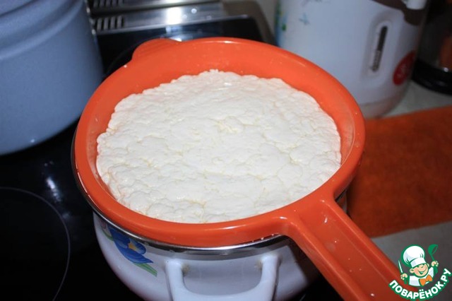Руками аккуратно переложить сырную массу в форму. У меня это - пластиковый дуршлаг. Вся масса сразу может не поместиться, подождите немного, пока она уплотнится и выкладывайте дальше. Руками разровняйте поверхность и постарайтесь удалить из формы максимальное количество сыворотки. Сыворотку не выливайте, на ней получается вкусная выпечка, из нее можно приготовить рикотту или бруност.