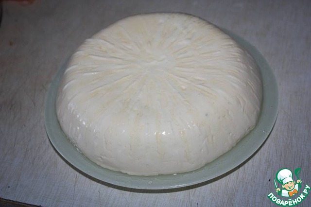 Оставить сыр самопрессоваться в течение 12 часов. В это время желательно сыр перевернуть несколько раз, чтобы прессовался в разные стороны. Через 4-5 часов сыр можно посолить, посыпав поверхность крупной солью.