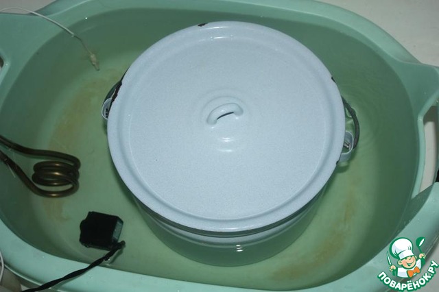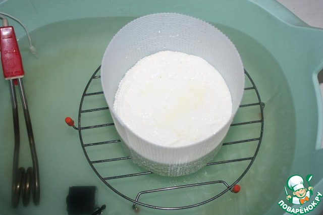 Выложить сырную массу в форму и поместить в теплую влажную камеру. Для этого на все ту же водяную баню поместить решетку от микроволновки и на нее поставить форму. Продолжать поддерживать температуру 50 градусов. Форма у меня самодельная, сделана из пластиковой канвы для трехмерной вышивки