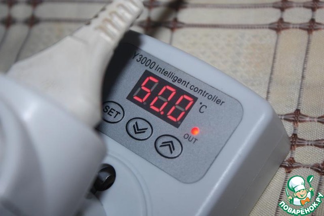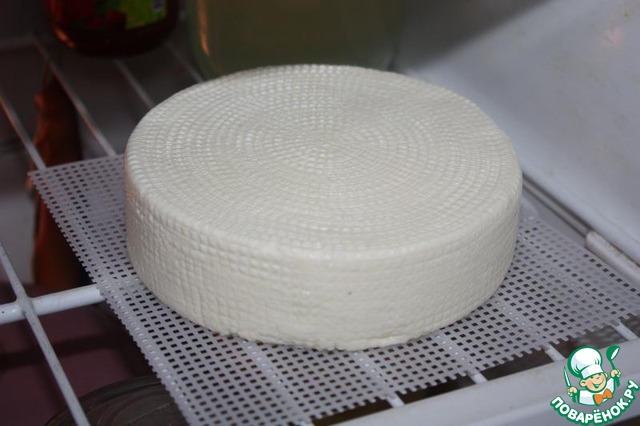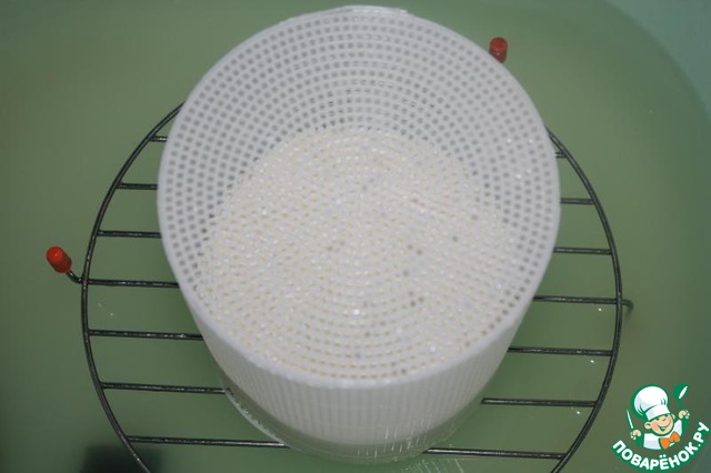 Через полчаса перевернуть сыр. Для этого накрыть ее крышкой или дренажным ковриком (все из той же канвы) и аккуратно перевернуть форму. Сыр сползет вниз и будет прессоваться в другом направлении. Держать в теплой камере 2 часа, каждые полчаса переворачивая. Далее вынуть и поместить решетку от микроволновки над миской, чтобы было куда стекать сыворотке. Дальше держать сыр при комнатной температуре, периодически переворачивая, пока не перестанет выделяться сыворотка.
