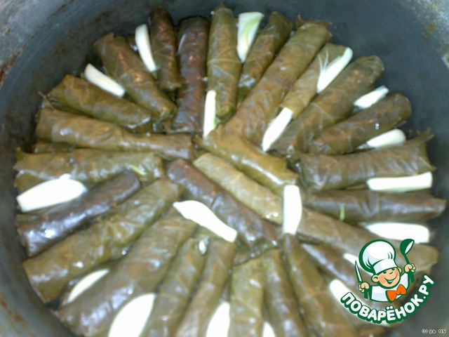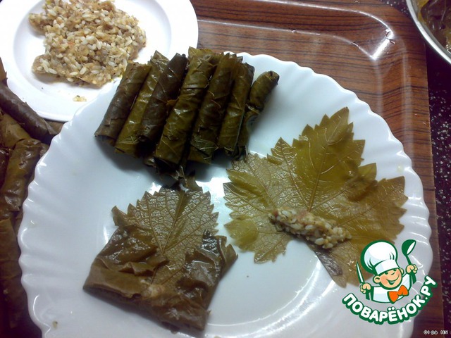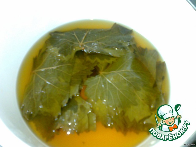 Виноградные листья (свежие или замороженные) бланшировать 4-5 минут в кипящей воде и затем откинуть на дуршлаг.