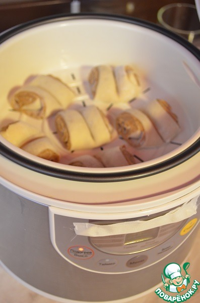 8. В мультиварку наливаем воду. Устанавливаем контейнер пароварки с булочками. Выставляем режим «подогрев» 10 мину. По истечении 10 минут, мультиварку выключаем и ждем еще 15 минут. Далее, включаем мультиварку в режим «Варка на пару» на 20 минут.