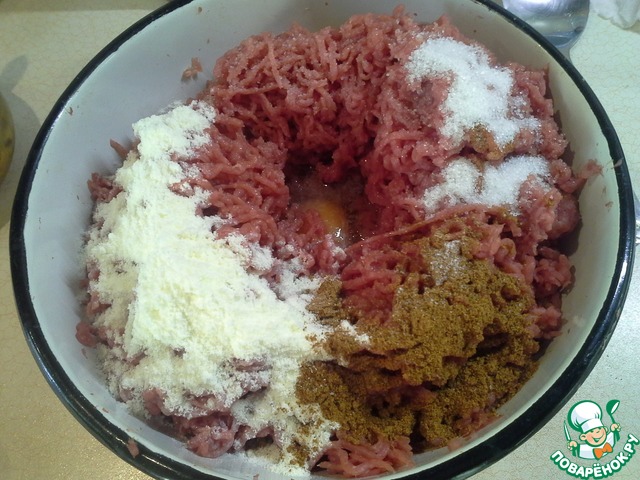В фарш добавляем яйцо, сухое молоко, специи. Все тщательно перемешиваем.