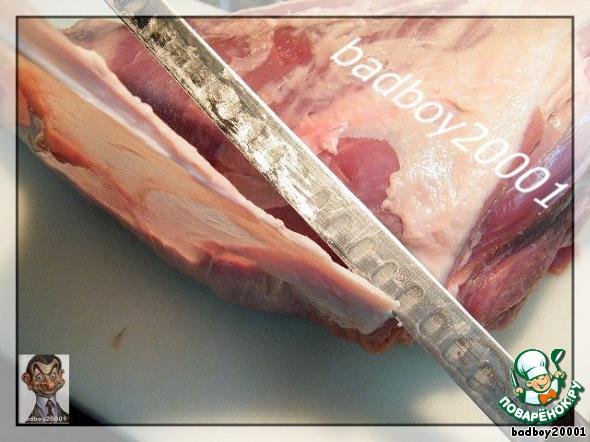 Вынуть надо заранее, чтобы мясо привыкало к окружающей температуре, вытрем остатки маринада, не поленимся, нашпигуем немного чесночком, включим духовку на разогрев, так как до долгожданной минуты осталось ровно 2 часа.