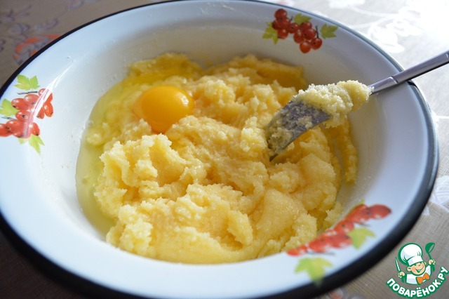 Размягченное сливочное масло растираем с сахаром. Добавляем 1 яйцо и хорошо перемешиваем.