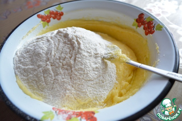 Добавляем муку с разрыхлителем, просеянные через сито. и замесить пластичное тесто.