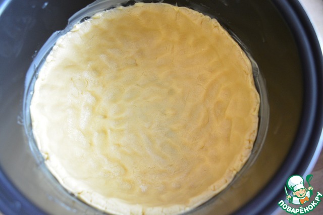 Чашу мультиварки смазываем сливочным маслом. Выкладываем наше тесто и распределяем его по дну чаши при этом оставляя бортики высотой 4 см.