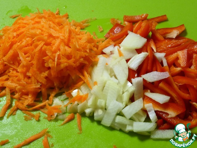 Почистить лук и морковь. Порезать сладкий перец, и лук, на крупной терке натереть морковь.
