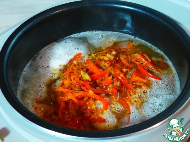 Пассированные овощи отправить в чашу мультиварки и дожидаемся завершения программы. Не забудьте посолить супчик.