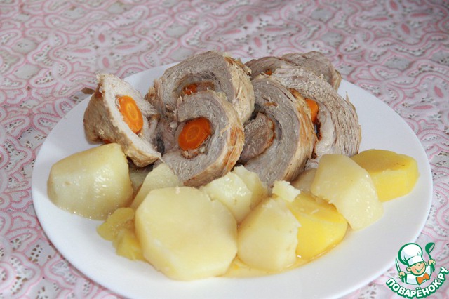 В центр положила морковь (к сожалению, фото забыла сделать), скрутила рулетик и перевязала нитками.