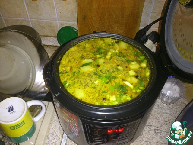 Минут за 15 до окончания программы всыпаем зелень, лавруху и душистый перец.