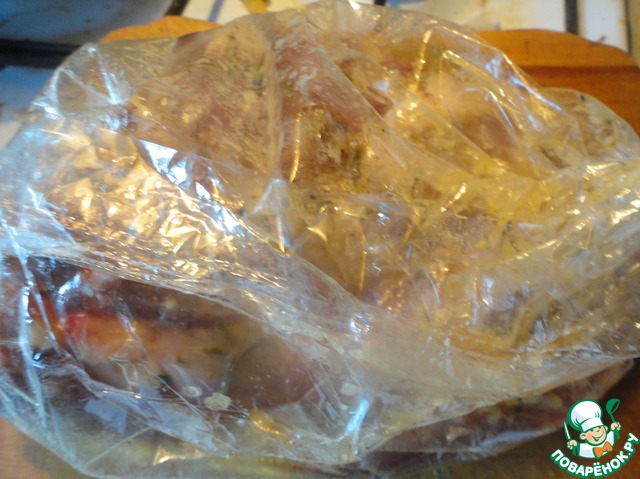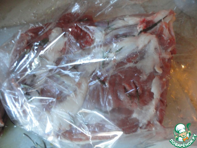 Заливаем маринадом и завязываем ниткой второй край мешка. Тщательно встряхиваем мешок, чтобы маринад равномерно обволок баранину. Ставим в холодильник на 12 часов.