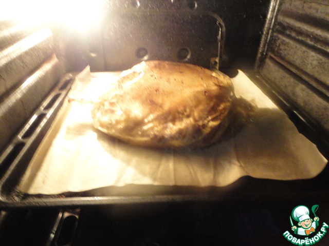Я не решилась запекать целую ногу, т. к. в случае неудачного результата мне пришлось бы это съедать самой, а в меня вся нога явно не влезет! Поэтому ногу я разделила на две части. Нижнюю отправила в морозиловку до лучших времен, а верхнюю (бедро) - подготовила для запекания.