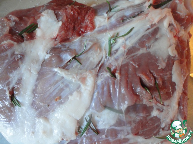 Баранину я натерла солью, сделала надрезы, разобрала розмарин на листочки и нашпиговала ими баранину.