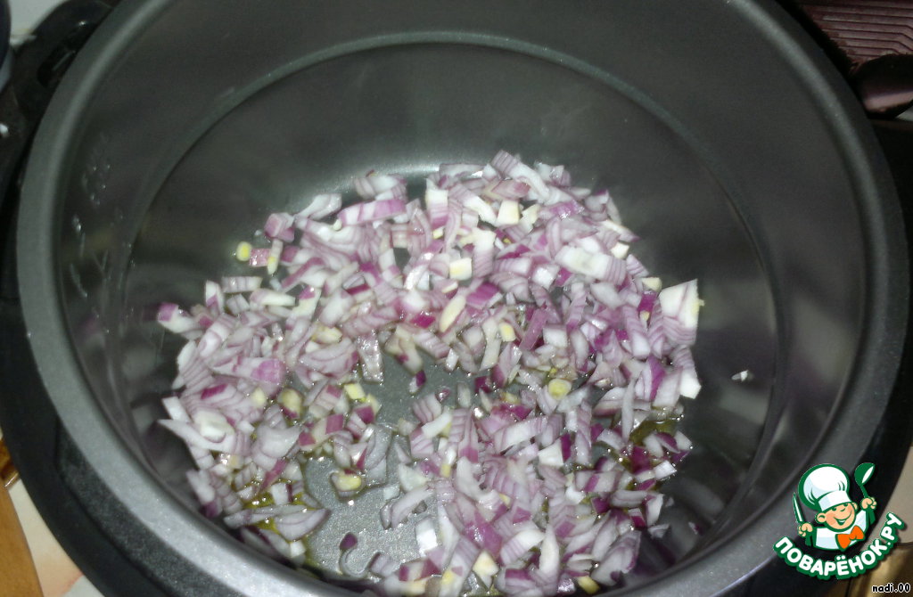 Обжариваем лук на оливковом масле в чаше мультиварки в режиме "выпечка", добавляем нашу фасоль (предварительно замоченную), добавляем воду (чтобы только покрыла фасоль), перемешиваем, ставим режим "суп" (или тушение) на 15 мин (не солим!!!)