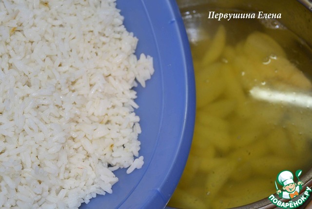 Рис отварить в подсоленной воде. Согласно инструкции варить нужно 12 минут. А мы варим 9-10.
