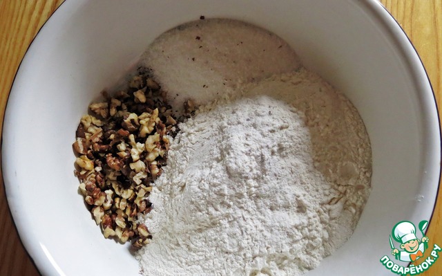 В миске смешать орехи, сахар и просеянную муку.