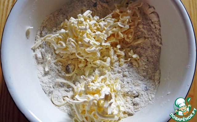 Достать масло из морозилки и натереть на крупной терке. Добавить к мучной смеси и руками перетереть всю массу в крошку.