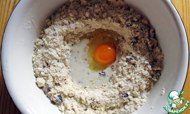 Сделать в крошке "колодец" и влить туда молоко и яйцо.