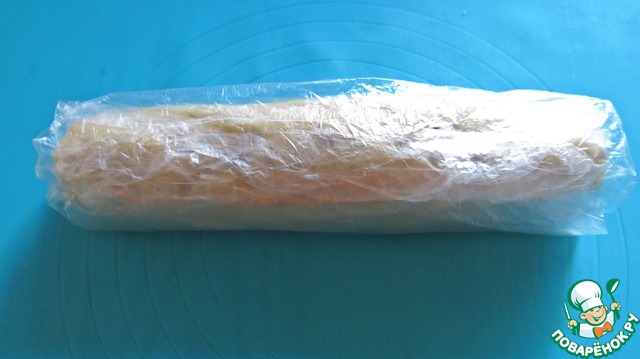 Замесить тесто. Сначала оно будет очень липнуть к рукам, но потом уплотнится. Когда тесто будет готово, надо сделать из него "колбаску"!