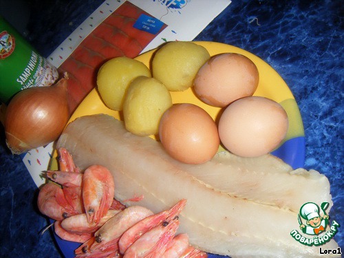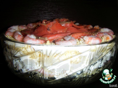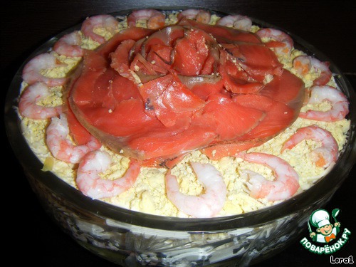 Украшаем сверху креветками и розочкой из нарезки красной рыбки.