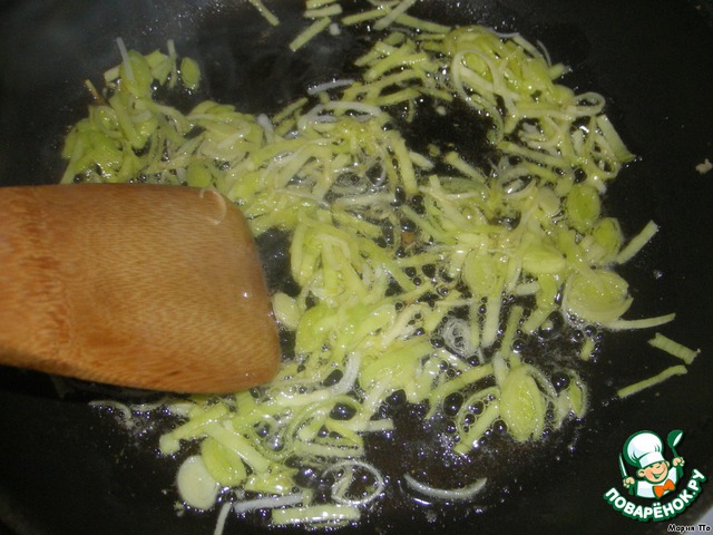 Кальмары нарезаем кольцами и укладываем в форму, начиняем.