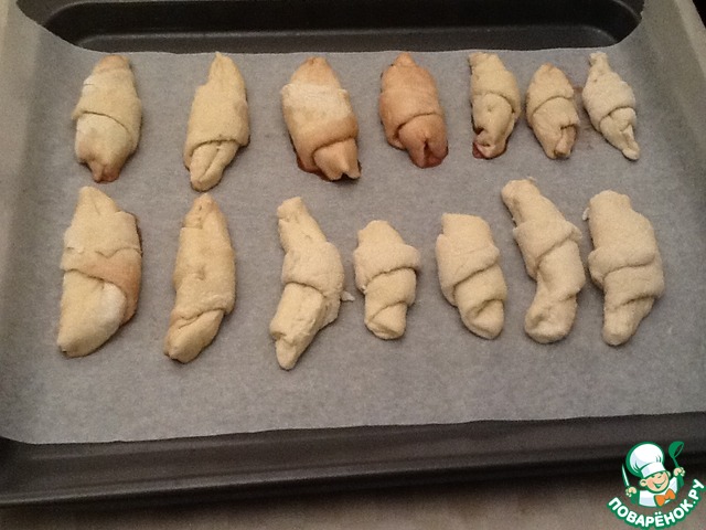 Круассанчики вкусные и без начинки, но по желанию делаем с начинкой. Я делала с клубничным вареньем и с шоколадом. Выкладываем начинку и заворачиваем наш круассан с широкого края к узкому. С начинкой НЕ ПЕРЕБОРЩИТЬ!!! А то я думаю положу от души!!! Вся кухня была в начинки!!! Выкладываем круассанчики на противень. Смешать 4 ст. ложки воды с 1 ст. Ложкой сахарной пудры. Смазать этим круассаны. Выпекать 20 минут при температуре 180 градусов.