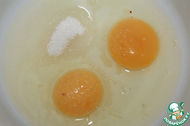 Готовим блинчики. Для этого взбиваем миксером яйца, соль и сахар. Можно сделать это венчиком. Взбиваем не долго, избегаем лишней пены.