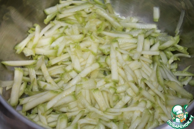 Сыр трем на мелкой терке. Половину добавляем к кабачку.
